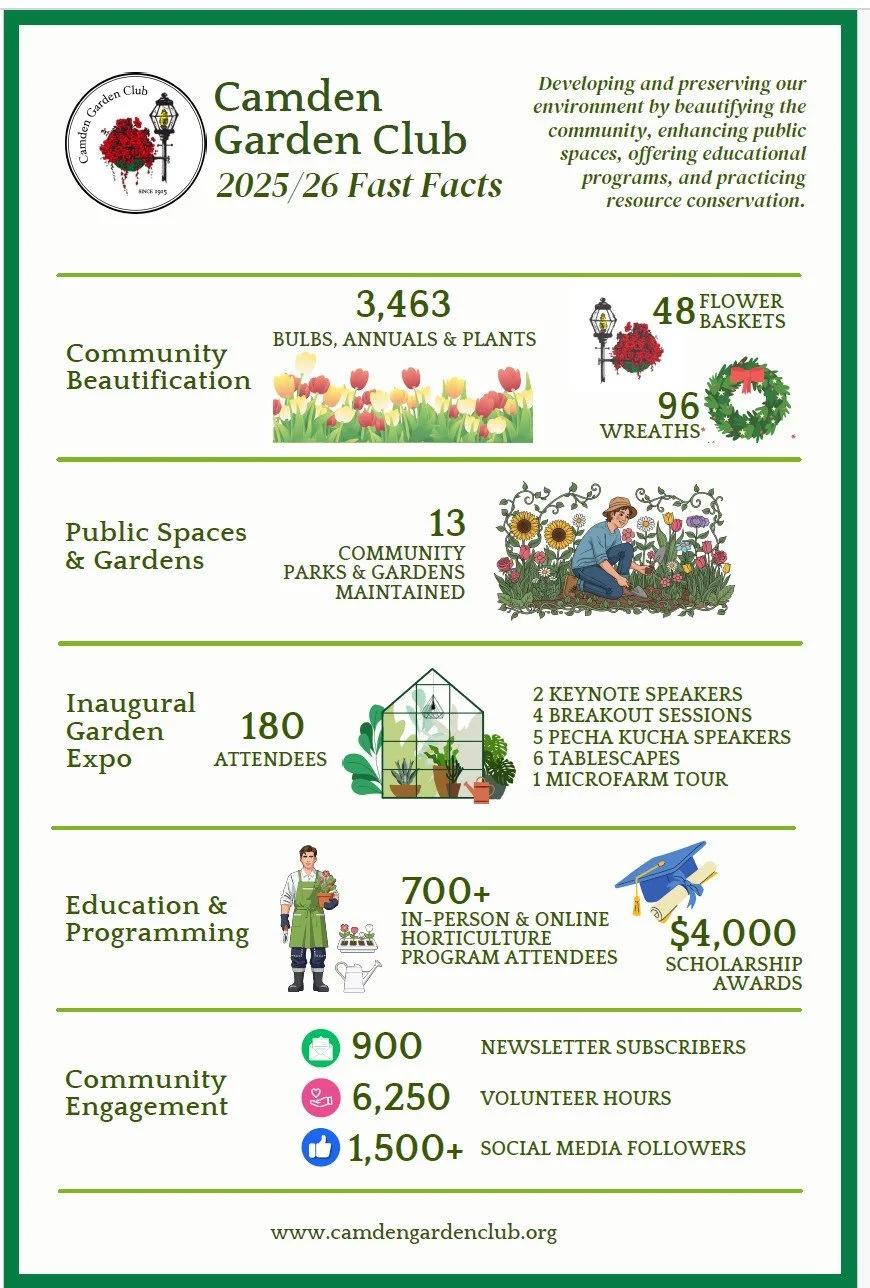 The Camden Garden Club is a the oldest garden club in Maine. The Club was founded in 1915 by a group of like-minded women with the mission to develop and preserve the beauty in and around Camden, Maine. The Club was federated in 1931. Over a century later, our efforts have expanded to include promoting civic improvements, education and the conservation of our natural resources. The Camden Garden Club is a founding member of the Garden Club Federation of Maine and a longtime member of National Garden Clubs, Inc.. Learn more about our history. On November 29, 2022, Camden Garden Club became a registered independent 501(c)3 nonprofit. Its tax identification number is 01-0383583. Prior, it was fiscally sponsored by the Garden Club Federation of Maine, also a registered 501(c)3 nonprofit. Independent nonprofit status allows the Camden Garden Club to better fulfill its mission.